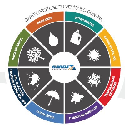 *El GardX Vehicle Protection System (Sistema de protección de vehículos de GardX) ha sido probado de conformidad a la normativa británica EN ISO 2812-5:2007. Los contenidos de los Paquetes de llevar a a casa de cliente pueden variar. El sistema de protección de vehículos CX2 Ceramic de GardX solo puede adquirirse en un distribuidor autorizado y ser aplicado por él mismo.
